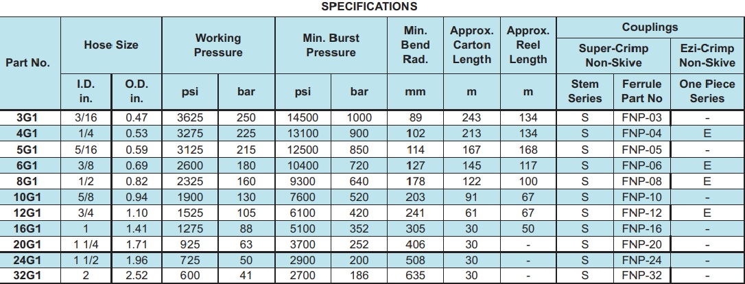 Applications: Medium pressure hydraulic lines. Meets or exceeds the requirements of SAE 100R1, ISO 1436 1SNR1 and EN 853 1SN.